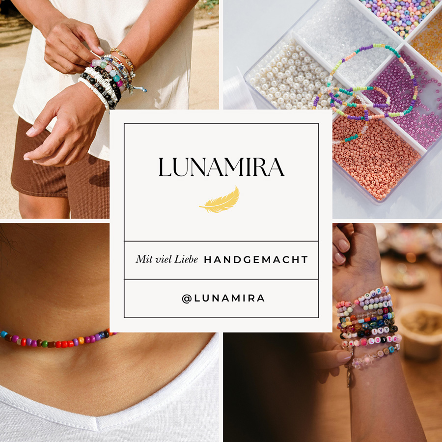 Lunamira ist mein Ort für handgemachten Schmuck – schlicht, leicht und voller Herz. Jedes Stück entsteht aus Schnur, Draht oder Perlen, aus Edelsteinen, Glas oder Acryl, aber vor allem aus Ruhe, Intuition und Freude. Ich möchte, dass meine Kreationen nicht nur schön sind, sondern auch eine kleine Portion Leichtigkeit und positive Energie mit auf den Weg geben.